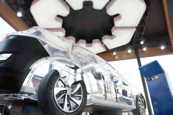 Into the main booth area, chandeliers shaped by hexagonal gear LOGO, with the heart of the craftsman to create the ultimate transparent SUV model car, focused on the four superior products of the business division. It is worth mentioning that Shuanglin is also the only auto parts company participating in the exhibition and the only company that uses the vehicle model to present its products.