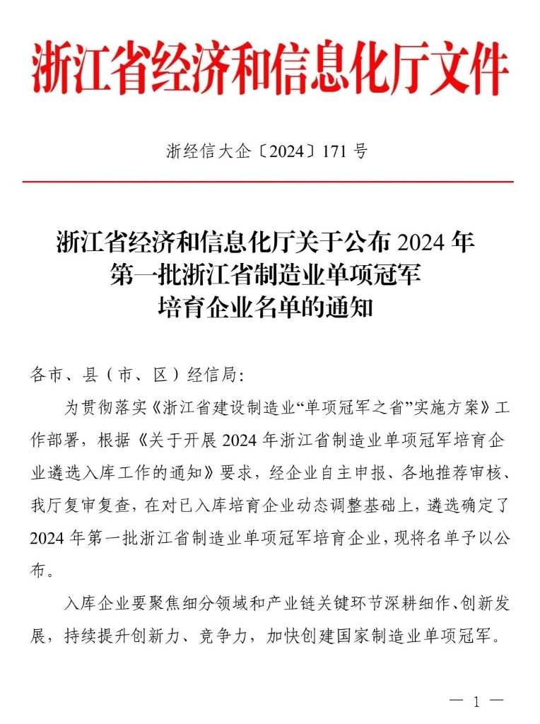 日前,浙江省经济和信息化厅公布了2024年第一批浙江省制造业单项冠军培育企业名单,根据《关于开展2024年浙江省制造业单项冠军培育企业遴选入库工作的通知》要求,经企业自主申报、各地推荐审核、省厅复审复查,双林荣登榜单。